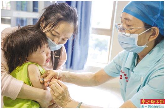 昨日上午,在广州天河区猎德社区卫生服务中心内,一批适龄儿童成功接种了国产13价肺炎多糖结合疫苗。这款全球第二款、国内首款肺炎疫苗,去年年底获批上市,今年5月中旬完成广东省级招标平台采购流程后第一次在广州的孩子身上进行接种。该疫苗6周龄-5岁(6周岁生日前)全年龄段儿童均可接种,可预防由13种血清型肺炎球菌引起的感染性疾病(包括肺炎、脑膜炎、败血症和菌血症等)。 南都记者 谭庆驹 摄