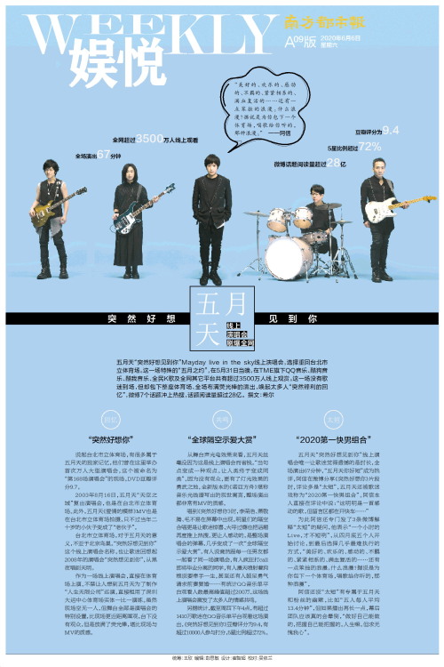 五月天“突然好想见到你”Mayday live in the sky线上演唱会,选择重回台北市立体育场。这一场特殊的“五月之约”,在5月31日当晚,在TME旗下QQ音乐、酷狗音乐、酷我音乐、全民K歌及全网其它平台共有超过3500万人线上观赏。这一场没有歌迷到场,但却包下整座体育场、全场布满荧光棒的演出,唤起太多人“突然锋利的回忆”,微博7个话题冲上热搜,话题阅读量超过28亿。 撰文:希尔