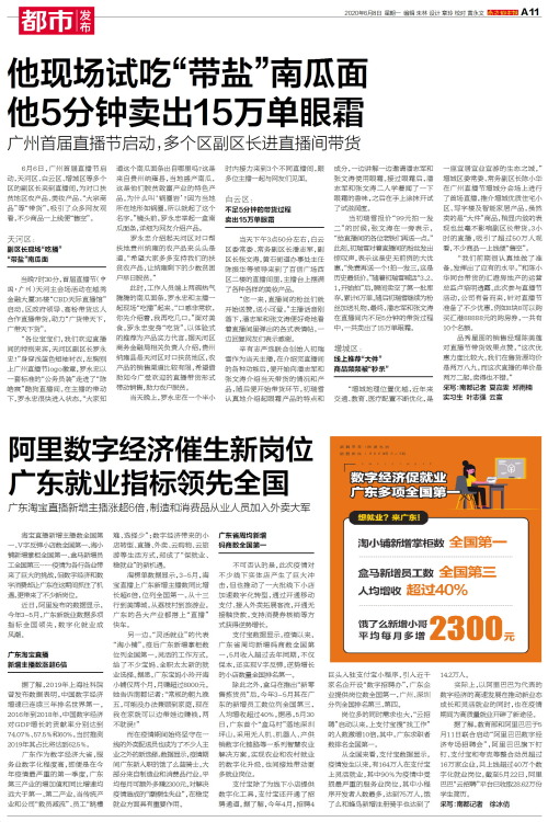 6月6日,广州首届直播节启动,天河区、白云区、增城区等多个区的副区长来到直播间,为对口扶贫地区农产品、美妆产品、“大宗商品”等“带货”,吸引了众多网友观看,不少商品一上线便“售空”。