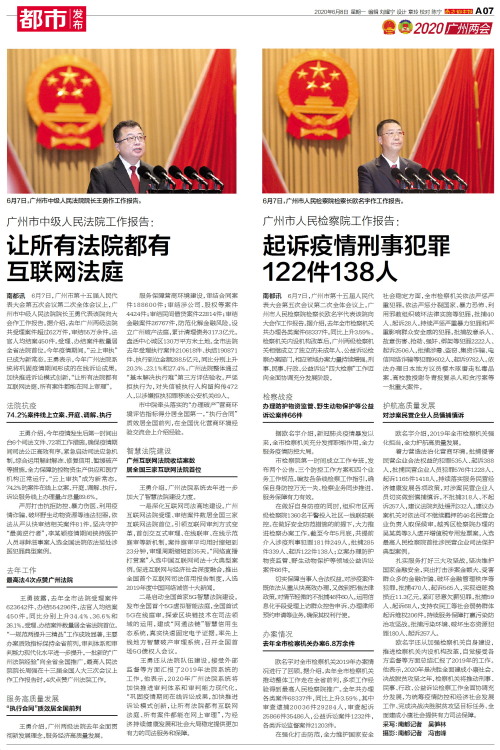 南都讯 6月7日,广州市第十五届人民代表大会第五次会议第二次全体会议上,广州市中级人民法院院长王勇代表该院向大会作工作报告。据介绍,去年广州两级法院共受理案件超过62万件,审结55万余件,法官人均结案
