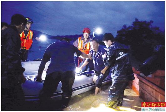昨日傍晚,广州增城正果镇浪拔村,消防队员用冲锋舟转移出西湖坳里房屋被淹的群众。据介绍,西湖坳里的水最深有3米多。截至昨日15时,增城、从化和花都区共有25座水库超汛限水位。据天气预报,今日广州有大雨局部暴雨。 南都记者 谭庆驹 摄