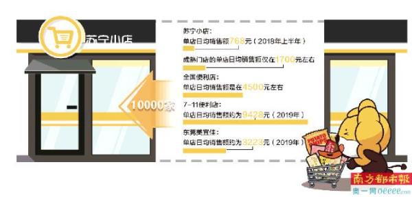 事实上,根据中国连锁经营协会数据,全国便利店单店日均销售额是在4500元左右。其中,便利店三巨头之一的7-11便利店2019年单店日均销售额约为9428元,以加盟为主的东莞美宜佳去年单店日均销售额约为3223元。由此不难看出,苏宁小店与主流便利店的盈利能力相比差距甚远,甚至与以加盟为主的美宜佳相比,差距也相当明显。
