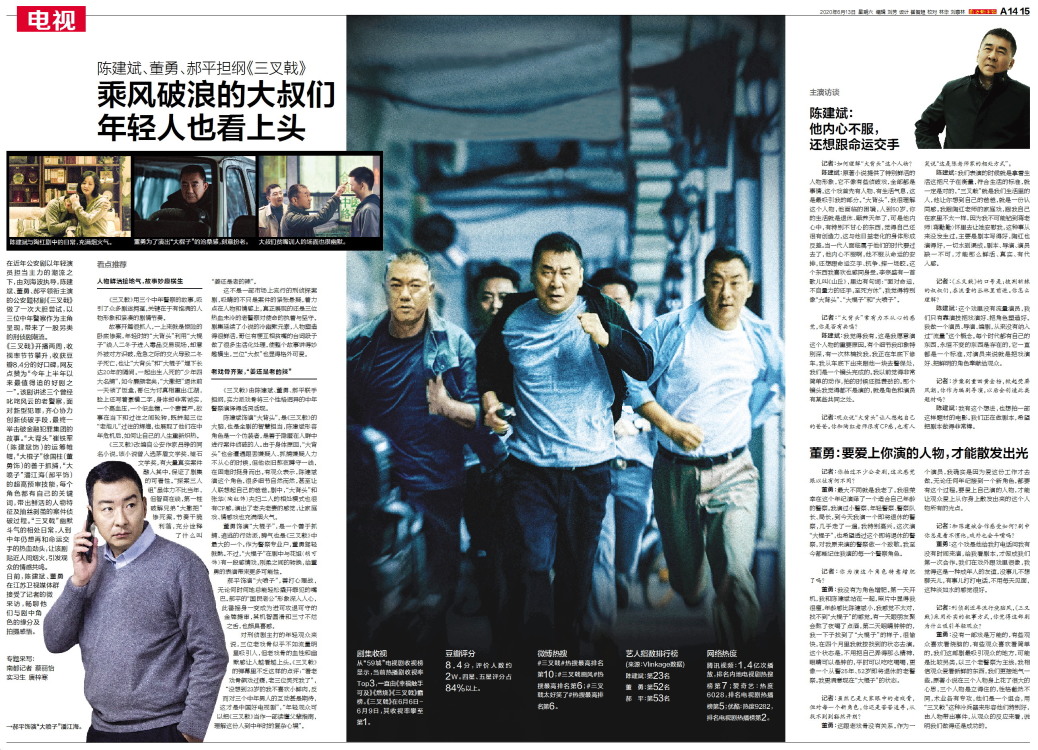 《三叉戟》开播两周,收视率节节攀升,收获豆瓣8.4分的好口碑,网友点赞为“今年上半年以来最值得追的好剧之一”。该剧讲述三个曾经叱咤风云的老警察,面对新型犯罪,齐心协力创新侦破手段,最终一举击破金融犯罪集团的故事。“大背头”崔铁军(陈建斌饰)的运筹帷幄,“大棍子”徐国柱(董勇饰)的善于抓捕,“大喷子”潘江海(郝平饰)的超高预审技能,每个角色都有自己的关键词,带出鲜活的人物特征及抽丝剥茧的案件侦破过程。“三叉戟”幽默斗气的相处日常,人到中年仍想再和命运交手的热血劲头,让该剧贴近人间烟火,引发观众的情感共鸣。