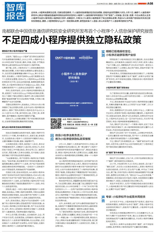 近年来,小程序快速普及应用,尤其在疫情期间,个人信息收集使用的情况愈加频繁,但相关监督管理鲜少涉及。6月11日,南都个人信息保护研究中心联合中国信息通信研究院安全研究所发布《小程序个人信息保护研究报告