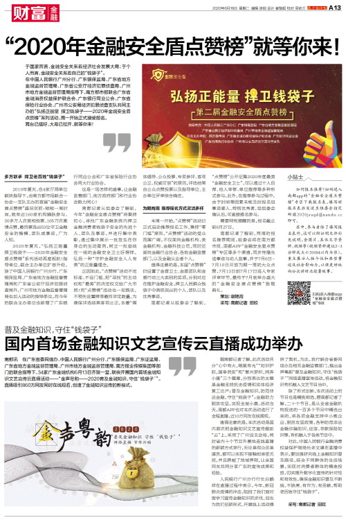南都讯 在广东省委网信办、中国人民银行广州分行、广东银保监局、广东证监局、广东省地方金融监督管理局、广州市地方金融监督管理局、南方报业传媒集团等部门的联合指导下,34家广东金融机构6月13日齐聚一堂,