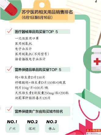 南都记者从苏宁获得的相关数据则显示,6月13日至14日,苏宁超市口罩销量暴增300.5%。苏宁悟空榜6月1日至16日的医疗器械单品累计交易量则显示,排名前10的品类分别是口罩、制氧机和电子血压计。而在广东省,医疗器械选购排名前三的分别是深圳、广州和东莞。