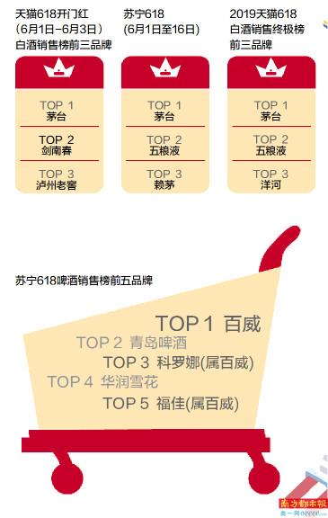 而在天猫去年的618终极战报(6月1日~20日)的榜单中,前三名还是茅台、五粮液及洋河。
