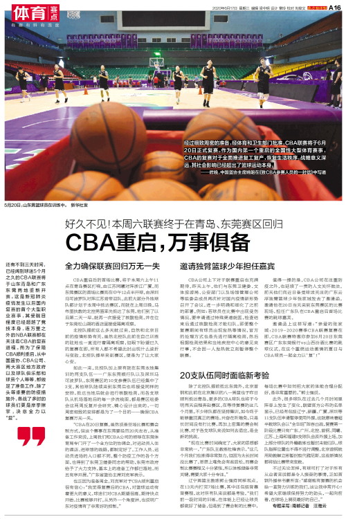 还有不到三天时间,已经阔别球迷5个月之久的CBA联赛将于山东青岛和广东东莞两地重新开赛。这是新冠肺炎疫情发生以后国内复赛的首个大型职业赛事,其受瞩目程度已经超越了竞技本身,连万里之外的NBA联赛都在关