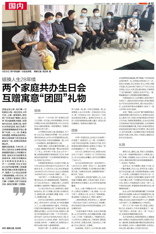 这是出生以来,他们第一次和亲生父母一起过生日。6月15日,上海一家饭馆内,曾引发广泛关注的“错换人生28年”双方家庭再次相聚,共同举办生日会。母亲们说,想弥补28年的遗憾,她们为两个28年前被错抱的孩