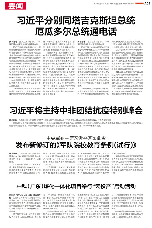新华社电 中央军委主席习近平日前签署命令,发布新修订的《军队院校教育条例(试行)》,自2020年7月1日起施行。《条例》深入贯彻习近平强军思想,深入贯彻新时代军事教育方针,围绕培养德才兼备的高素质、专