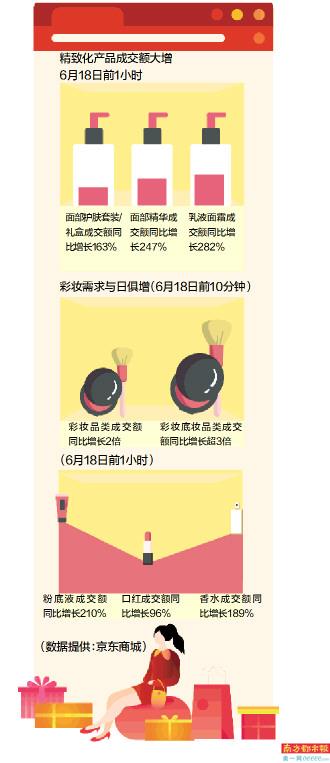 另一方面,一些化妆品品类今年销售额增长也十分迅猛。今年6·18前10分钟,京东的香水成交额同比增长189%,而在去年,京东的香水彩妆花了一小时成交额同比仅增195%。