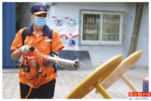 23日,在北京市海淀区八里庄街道定慧东里社区,工作人员对社区内的健身器材进行消杀。 新华社发