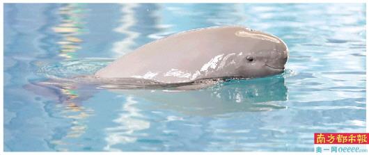 中国科学院水生生物研究所白鱀豚馆的饲养池中玩耍的小江豚。 新华社发