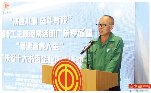 →4日,东莞农民工吴桂春在“决胜小康 奋斗有我”全国职工主题阅读活动暨“粤读点亮人生”广东省十大书香企业评选活动启动仪式上发言。 通讯员供图