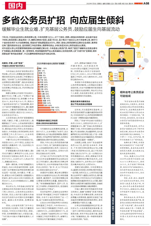 7月2日,宁夏自治区发布公务员招录公告,今年共招录1323人、877个职位,招录人数是去年两倍多,这也是宁夏近7年来公务员招录人数最多的一次。南都记者统计发现,截至7月3日,至少有20个省份已公布今年