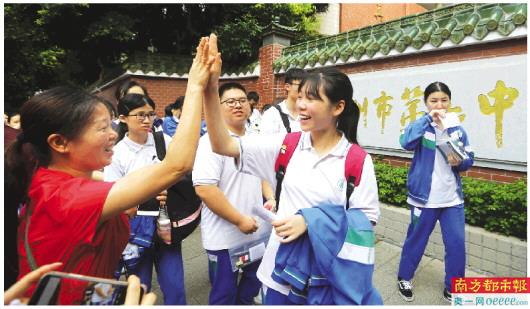 2019年6月7日,广州市第七中学考点,进入考场前考生与家长击掌加油鼓劲。 南都记者 冯宙锋 摄