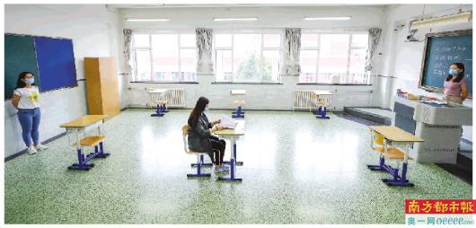 7月3日,在北京市第十二中学考点的备用考场内,老师在进行考前模拟演练。新华社发