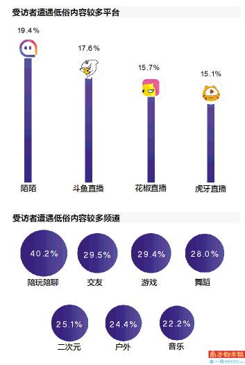 在四成受访者印象中,低俗内容常在“陪玩陪聊”频道出没,此外,分别有近三成受访者在交友、游戏、舞蹈、二次元频道发现低俗内容踪迹。