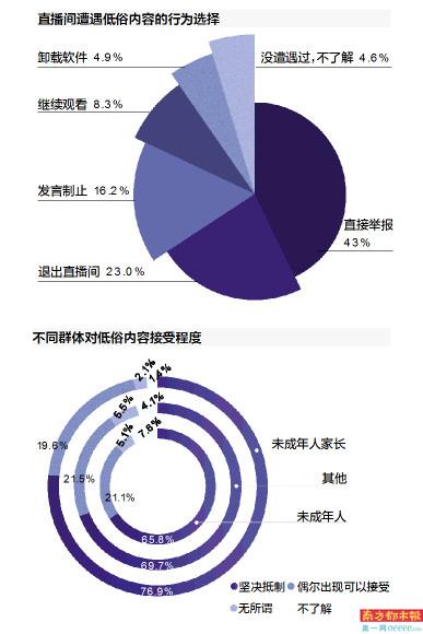 调查也发现,尽管持有抵制态度的受访者超过七成,但仅有四成左右会选择直接举报,一成多会选择发言制止。其余受访者通常以退出直播间、卸载软件的方式回应,或者继续观看。