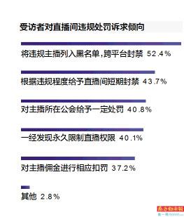 调查也对网友诉求进行收集,针对主播违规处罚力度,有超五成受访者支持平台将违规主播列入黑名单,并实施跨平台封禁。另有四成左右分别支持根据违规程度给予直播间短期封禁、一经发现永久限制直播权限、对主播佣金进行相应扣罚、主播违规需追究公会责任。
