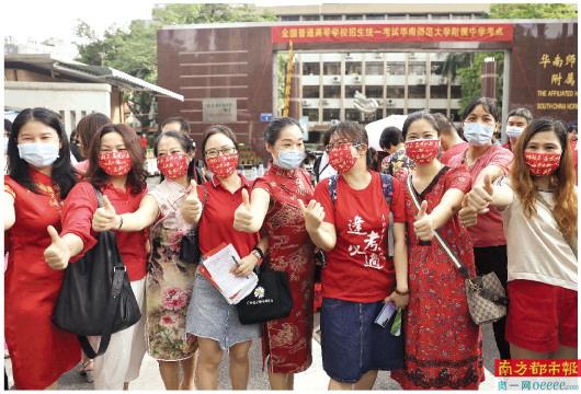 昨日高考首日,广州华南师范附属中学考点,不少家长穿红色旗袍,戴着有“高考必胜”字样的订制红色口罩给考生加油打气。 南都记者 马强 摄