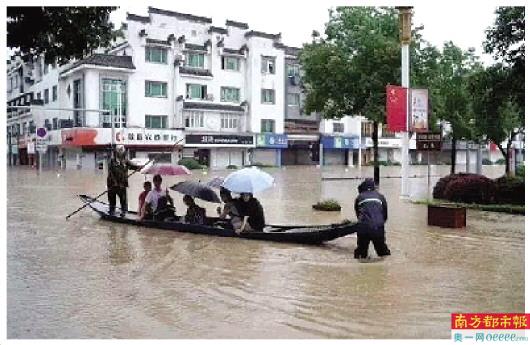 7日,歙县部分主要道路被洪水淹没,只能依靠船只通行。