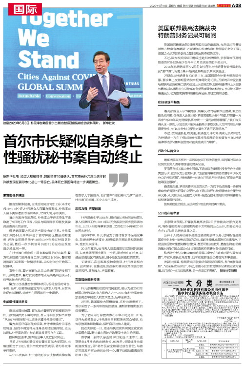 首尔市长疑似自杀身亡 性骚扰秘书案自动终止