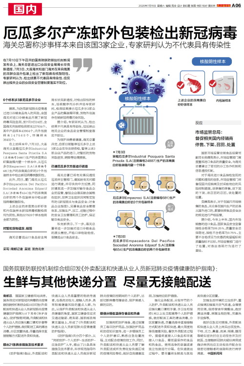 在7月10日下午召开的国务院联防联控机制新闻发布会上,海关总署进出口食品安全局局长毕克新通报,7月3日,大连海关和厦门海关在来自南美的冻鲜食品外包装上检出了新冠病毒核酸阳性。专家研判认为,检出结果不代