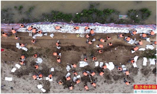 在沿江一处堤岸,南都记者见到驻浔空军部队正在现场加固沿江堤坝。据现场负责人介绍,该部队100余名官兵于7月11日接到通知连夜驰援江洲。“我们需要再用沙袋垒起60厘米左右的子坝,垒到23.5米的警戒水位。”