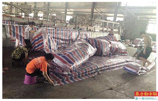 “九江开始告急的时候,新干县工信局联系上我们,说了一线紧急的情况,我们于是响应号召,把其他订单全停掉。24小时加班加点生产,全部发往防汛一线。”7月15日下午,江西省内最大的三色布生产厂家“启飞实业”的负责人邓启飞告诉南都记者,供应给防汛的三色布,与普通三色布相比,“会比普通的厚一点”。