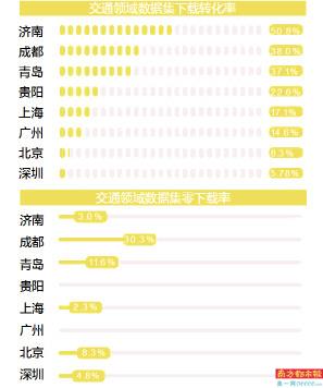 8市中,济南市公共数据开放网交通数据集下载转化率最高,为50.8%。其中,下载量最高的数据集是“济南市交通基本情况”,访问量最高的数据集为“济南市新型声屏障安装路段信息”。而深圳市政府数据开放平台排在末位,交通数据集下载转化率仅5.78%,其下载量、访问量最高的数据集为“深圳通刷卡数据”。