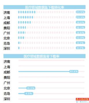 医疗数据下载转化率上,济南市公共数据开放网居于八市之首,为25.9%。访问量、下载量最高的数据集分别为“济南市镇卫生院等级评价”、“济南市住院定点医疗机构名单”。排名第二的是上海市公共数据开放平台,医疗数据集下载转化率为20.9%,在348349次访问中有72994条下载记录,访问量、下载量均为最高。深圳市政府数据开放平台医疗数据集下载转化率最低,仅为6.2%。