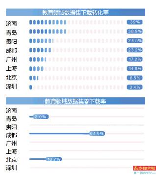 教育数据集下载转化率方面,济南市、青岛市公共数据开放网领衔,分别为39%、38.9%,深圳市政府数据开放平台数据集下载转化率较低。