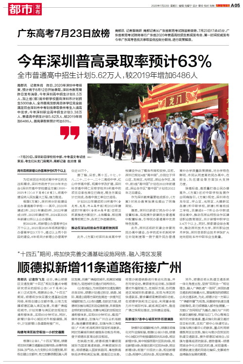 南都讯 记者朱倩 昨日,2020年深圳中考结束,预计将于8月12日开始录取。深圳市教育局昨日发布消息,今年深圳高中招生计划8.5万人,加上省(部)属中职学校面向深圳市计划招生5000余人,全市普高及职