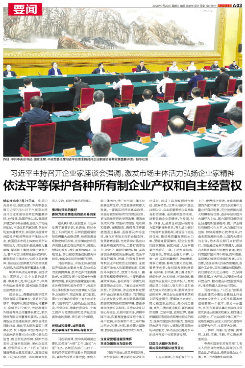 昨日,中共中央总书记、国家主席、中央军委主席习近平在京主持召开企业家座谈会并发表重要讲话。 新华社发 新华社北京7月21日电 中共中央总书记、国家主席、中央军委主席习近平7月2
