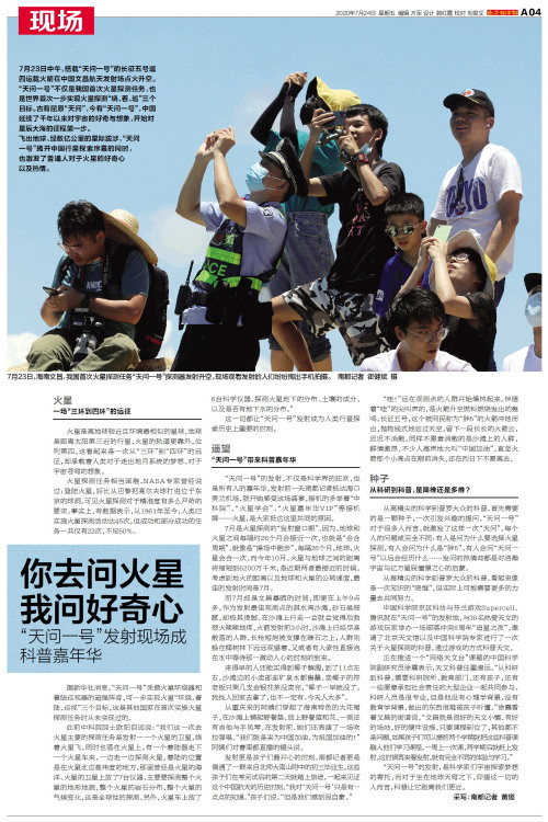 7月23日中午,搭载“天问一号”的长征五号遥四运载火箭在中国文昌航天发射场点火升空。“天问一号”不仅是我国首次火星探测任务,也是世界首次一步实现火星探测“绕、着、巡”三个目标。古有屈原“天问”,今有“