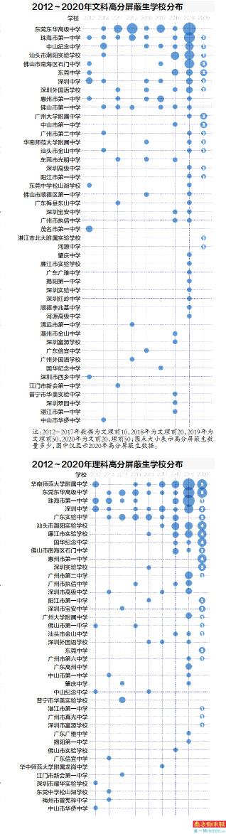 9年积累之下,共有10所学校文科高分考生超过5人,这10所学校中,两所来自东莞:东莞东华高级中学(21人)、东莞中学(8人);两所来自深圳:深圳中学(8人)、深圳外国语学校(6人);两所来自佛山:佛山市南海区石门中学(8人)、佛山市第一中学(6人);其余四所分别来自珠海市第一中学(13人)、中山纪念中学(9人)、汕头市潮阳实验学校(9人)、惠州市第一中学(6人)。其中,东莞东华高级中学、汕头市潮阳实验学校是为数不多的两所民办学校。