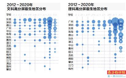 2012~2020年,理科高分考生共180人。来自地区呈现明显头尾分布,近六成扎堆在广州、深圳、东莞。