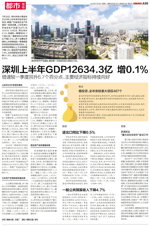 7月28日,深圳市统计局发布2020年上半年深圳经济运行情况。根据广东省地区生产总值统一核算结果,上半年深圳市地区生产总值(GDP)为12634.30亿元,同比增长0.1%,增速较一季度回升6.7个百