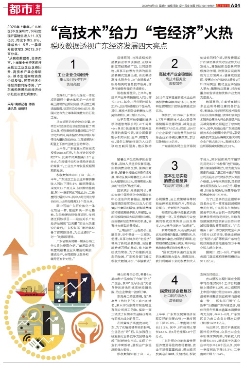 2020年上半年,广东地区(不含深圳市,下同)实现开票销售收入11.9万亿元,同比下降3.8%,降幅比1-5月、一季度分别收窄3.0和13.0个百分点。 “从税收数据看,总体而言,上半年全省经济运行呈
