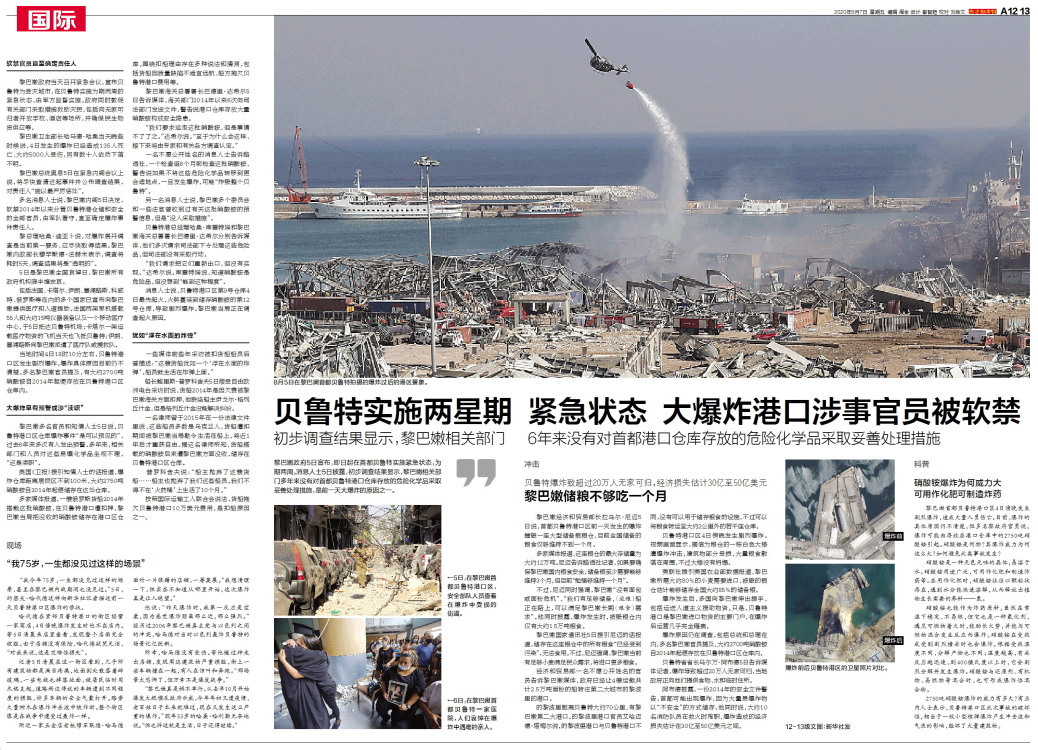 黎巴嫩政府5日宣布,即日起在首都贝鲁特实施紧急状态,为期两周。消息人士5日披露,初步调查结果显示,黎巴嫩相关部门多年来没有对首都贝鲁特港口仓库存放的危险化学品采取妥善处理措施,是前一天大爆炸的原因之一。