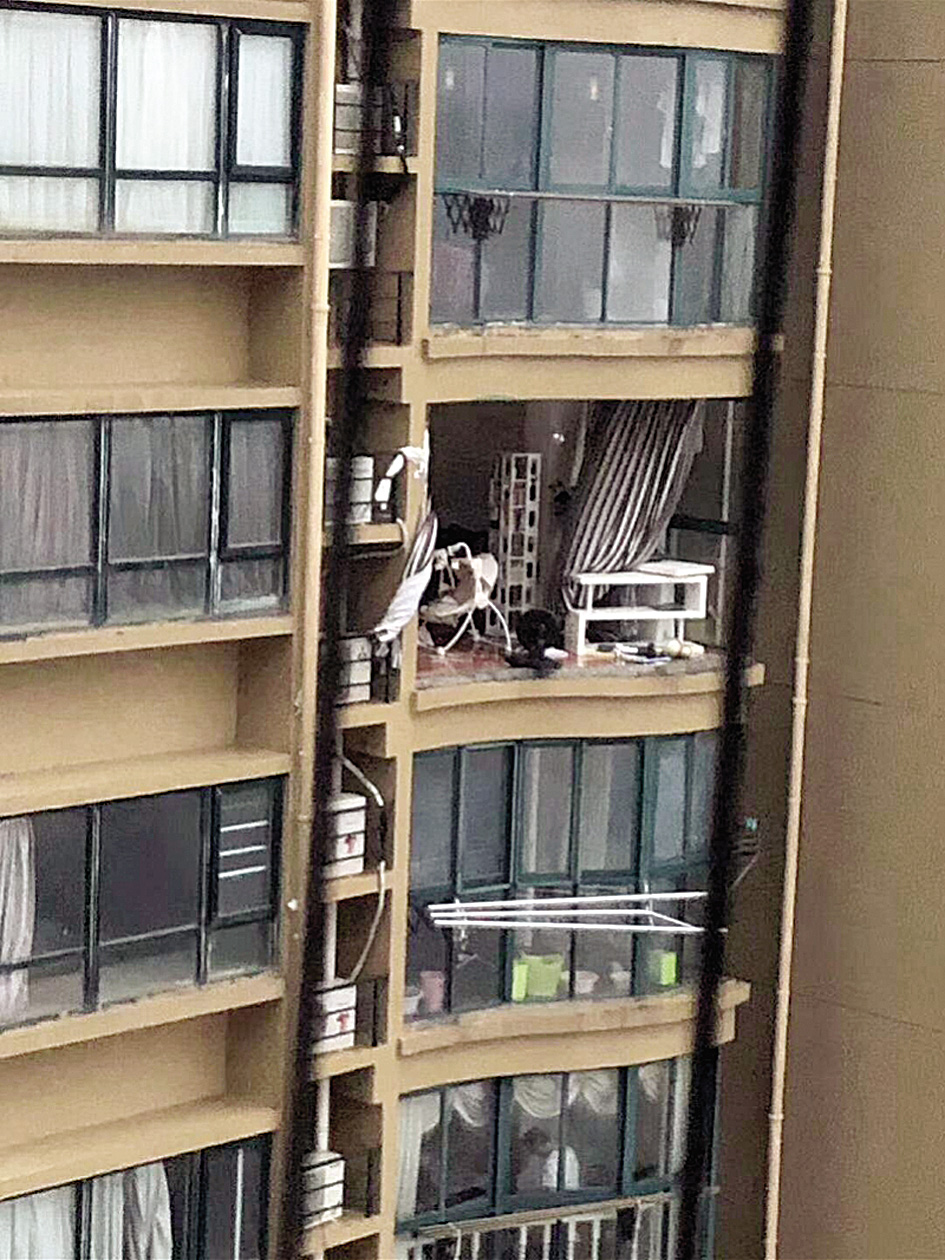事发小区,部分高层住宅整面窗户被吹坏,玻璃破碎,房间内一片狼藉。 资料图片