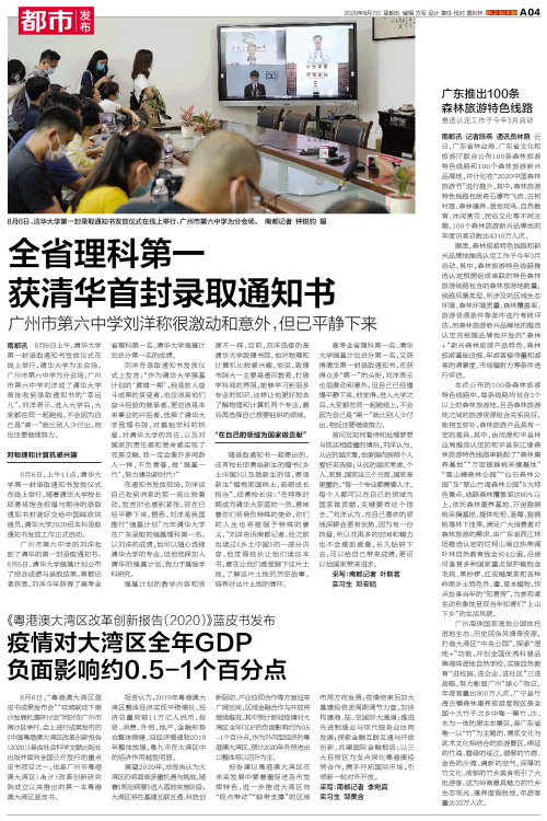 南都讯 8月6日上午,清华大学第一封录取通知书发放仪式在线上举行,清华大学为主会场,广州市第六中学为分会场。广州市第六中学刘洋成了清华大学首批收到录取通知书的“幸运儿”。刘洋表示,进入大学后,大家都在