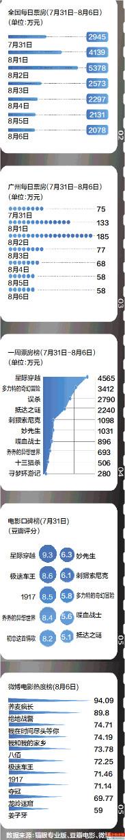 上周一开始日票房超过1500万,进入8月之后,影迷的观影热情再次爆发,8月1日单日突破4000万,8月2日一举突破5000万,8月首个周末的票房接近1亿。其中8月1日出票140万张,8月2日出票177万张,两天走进影院的人数超过300万。广州本地8月1、2日两天票房也超过300万。