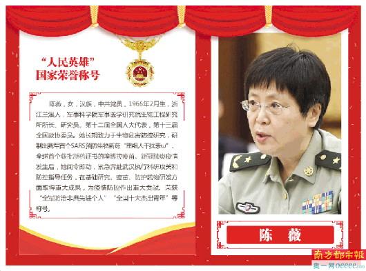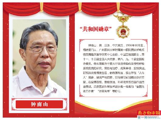 新华社电 国家主席习近平11日签署主席令,根据十三届全国人大常委会第二十一次会议11日下午表决通过的全国人大常委会关于授予在抗击新冠肺炎疫情斗争中作出杰出贡献的人士国家勋章和国家荣誉称号的决定,授予钟南山“共和国勋章”,授予张伯礼、张定宇、陈薇(女)“人民英雄”国家荣誉称号。