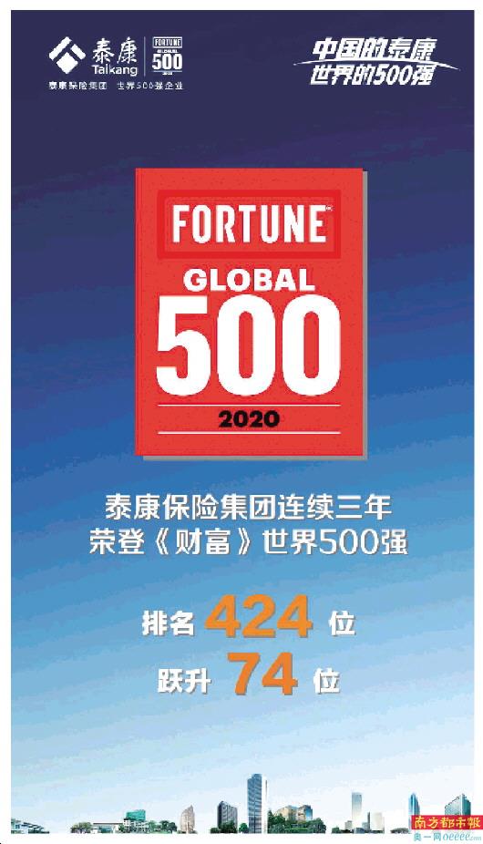 8月10日,2020年《财富》世界500强排行榜正式发布,泰康保险集团以295.02亿美元的营业收入大幅跃升至榜单第424名,排名大幅跃升74位,成为中国排名上升第三快的公司。