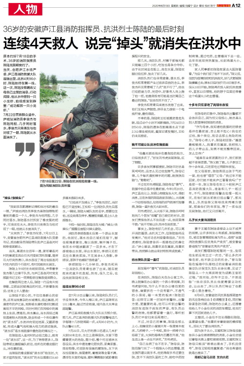原本约好7月18日的手术,36岁的消防指挥员陈陆无限期爽约了。当天,合肥庐江水情严重,庐江县消防救援大队连轴出警。此后4天96小时,陈陆始终在第一线。这一次,陈陆没有瞒着父母自己出警的消息。行动间隙,