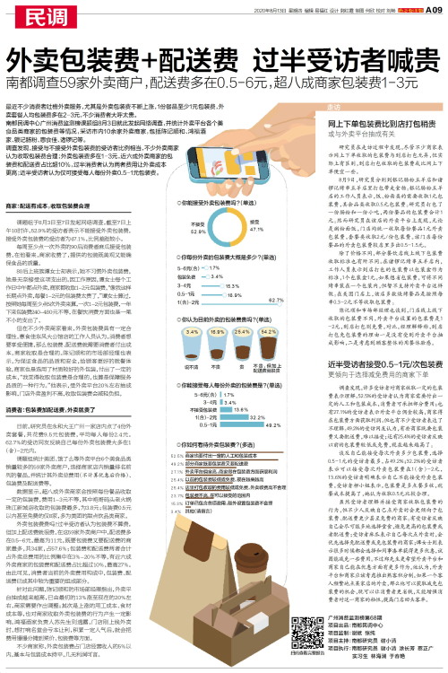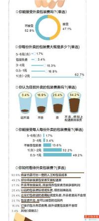 最近不少消费者吐槽外卖服务,尤其是外卖包装费不断上涨,1份餐品至少1元包装费,外卖套餐人均包装费多在2-3元,不少消费者大呼太贵。南都民调中心广州消费监测榜课题组8月3日就此发起网络调查,并统计外卖平