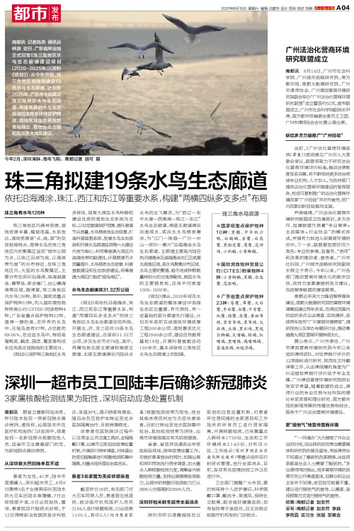 南都讯 记者陈燕 通讯员林荫 近日,广东省林业局正式印发《珠三角地区水鸟生态廊道建设规划(2020-2025年)》(简称《规划》),从今年开始,珠三角地区将陆续建设19条水鸟生态廊道,计划至2025年