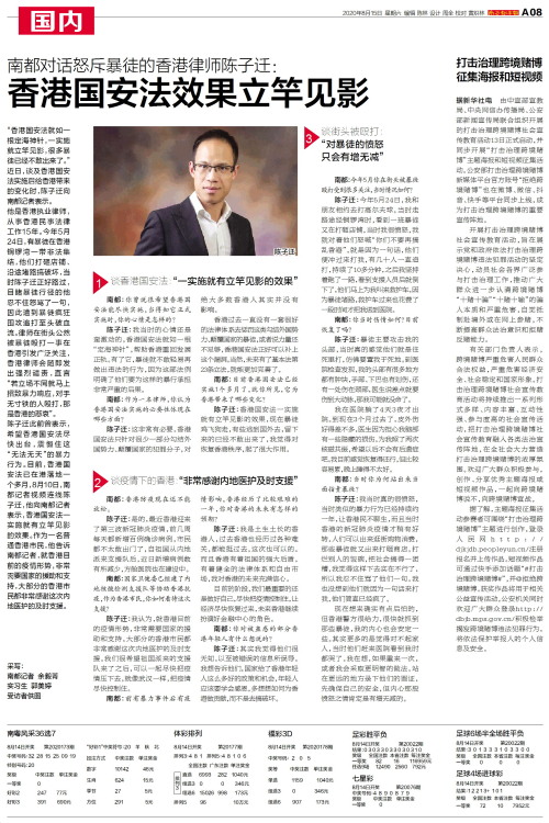 “香港国安法就如一根定海神针,一实施就立竿见影,很多暴徒已经不敢出来了。”近日,谈及香港国安法实施后给香港带来的变化时,陈子迁向南都记者表示。他是香港执业律师,从事香港民事法律工作15年。今年5月24
